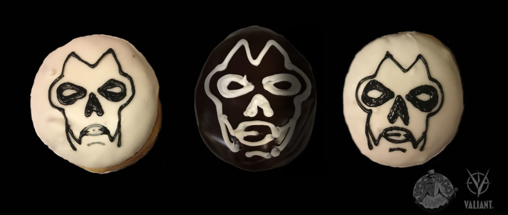 What better way to honor the much-anticipated return of Valiant’s own voodoo-powered icon than with a one-of-kind collaboration with Portland’s world-famous Voodoo Doughnut? Custom designed by Voodoo’s renowned team of sugar-inspired artisans, attending retailers will have their choice of two exclusive Shadowman specialties, each adorned with a hand-piped rendition of the character’s iconic mask – chocolate on a vanilla frosted doughnut filled with chocolate Bavarian cream, or vanilla on a chocolate frosted doughnut filled with raspberry jelly – during Valiant’s annual ComicsPRO presentation on Friday, February 23rd.