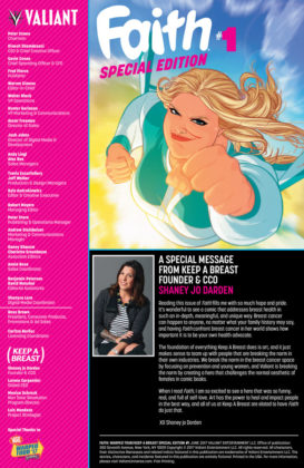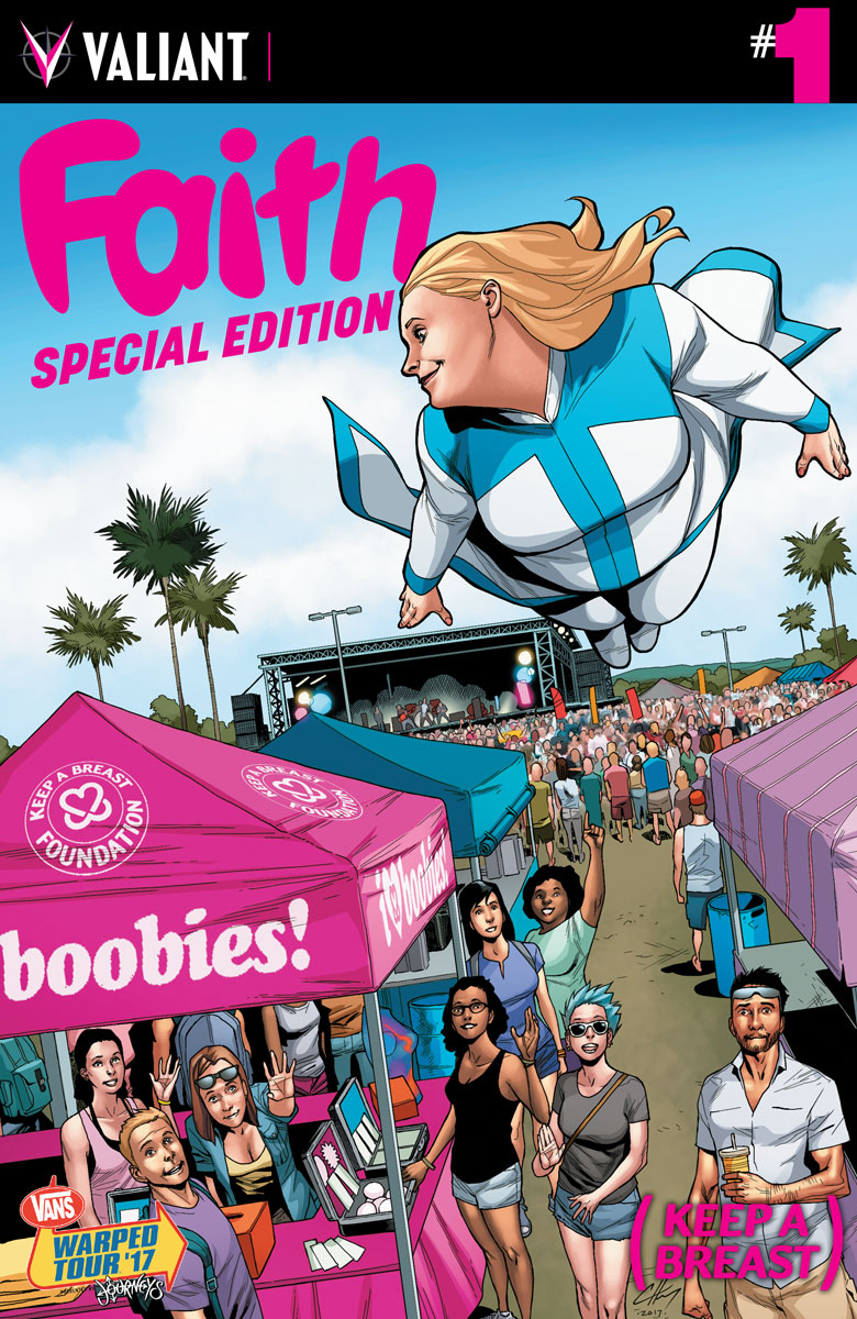 Available exclusively at the Vans Warped Tour ’17® presented by Journeys®, pick up your copy of the FAITH WARPED TOUR/KEEP A BREAST SPECIAL EDITION #1 – a brand-new, never-before-seen Faith story written by rising star Justine Prado (Finding Molly) with art by Valiant superstar Clayton Henry (ARCHER & ARMSTRONG) and Eisner Award nominee Kate Niemczyk (FAITH, Mockingbird). Get ready to meet Los Angeles’ leading superhero, Faith “Zephyr” Herbert, as she confronts the realities of breast cancer head-on in a special standalone story, created in collaboration with The Keep A Breast Foundation. Faith has saved her city from alien invaders and common criminals alike…but when a different, more personal kind of scourge hits close to home, can Faith show strength in the face of an all-too-common affliction that has affected millions of women and men around the world?
