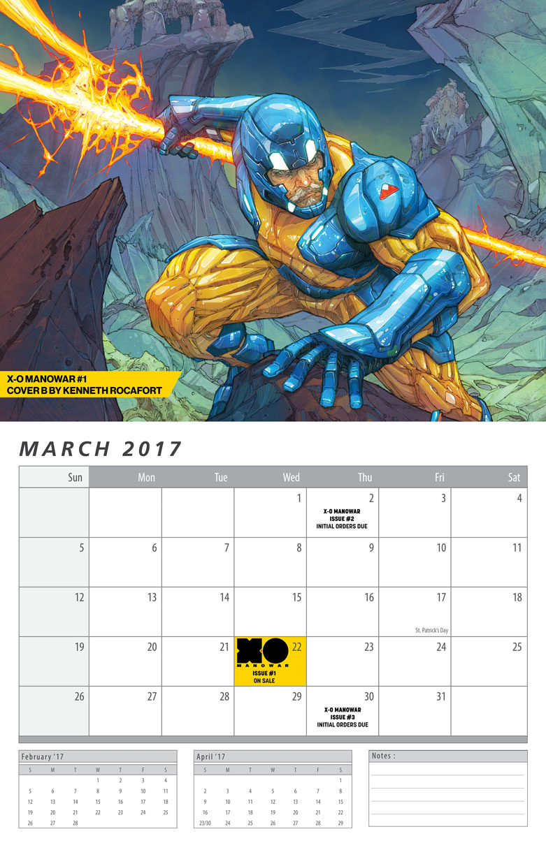 “We’ve told fans and retailers in no uncertain terms that the new X-O MANOWAR series may very well be the most vitally important series that we have ever published,” said Valiant Publisher Fred Pierce. “Now, we’re putting our money where our mouth is – and continuing Valiant’s record-setting streak of on-time shipping – by giving retailers a major new tool for promoting the series in their store with ‘X–O MANOWAR WEDNESDAY’ dates marked on this calendar. At the end of every month, on every fourth Wednesday in 2017, Valiant will be putting a major new release into stores for fans to rally around. And it all starts with X-O MANOWAR #1 on March 22nd. We’re extremely confident in the strength of this series with the first 13 issues already in production. Our new ‘X-O MANOWAR WEDNESDAYS’ are just the latest display of the momentum we’re putting behind this series, and just how far our plans for X-O MANOWAR stretch in 2017 and beyond.”
