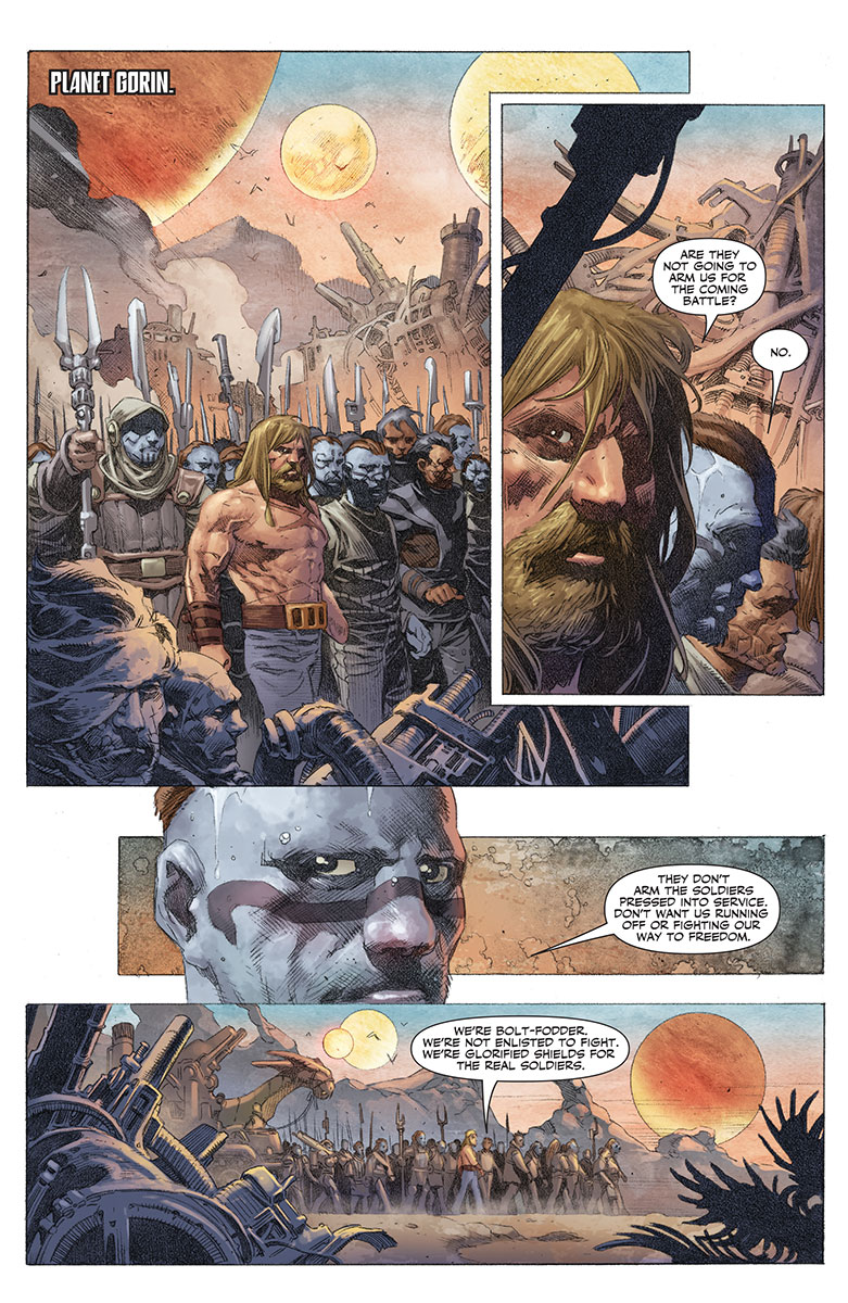 A brutal, deep-space saga awaits Valiant’s premiere hero here, as he enters a herculean voyage through the cosmos unlike anything fans have seen before! Alien planets, all-new characters, and out-of-this-world adversaries will stand revealed as Aric of Dacia rises from SOLDIER to GENERAL to EMPEROR to VISIGOTH in a star shattering adventure!