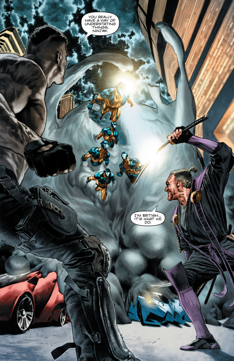 Los Angeles. Thirty years later. The new mystery at the center of America’s post-apocalyptic future stands revealed when Bloodshot and Ninjak finally discover the identity of the Man in the White Tower. Who is he? Why does he ruthlessly rule over Los Angeles? And what is his connection to the silent army of X-O Manowar sentries that police this world, the strange Goo-tech that pervades it…and to even Bloodshot himself?