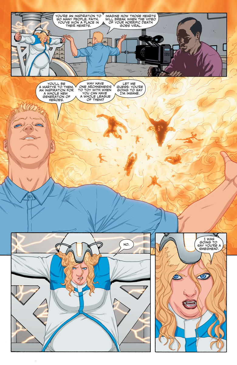 Trapped with no aid in sight, Faith is coming face to face with her very-first supervillain! LA’s own sky-soaring hero always wanted to be like the comic book characters that inspired her…but is she ready to deal with the consequences of being a bonafide superhero? And, as if a new arch-nemesis weren’t enough, a shadowy figure is closing in on Faith’s secret identity! How’s that for a cliffhanger?!