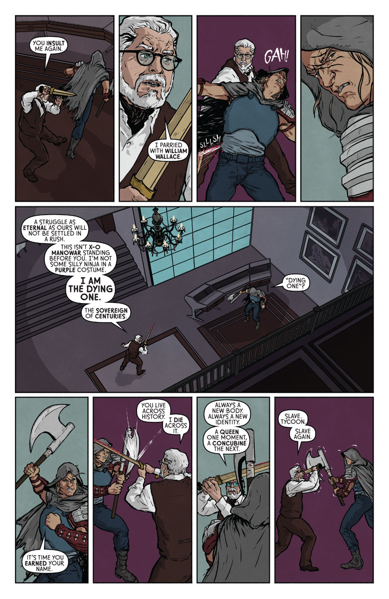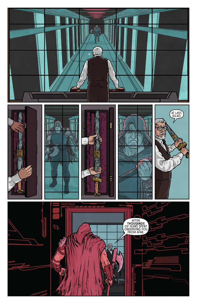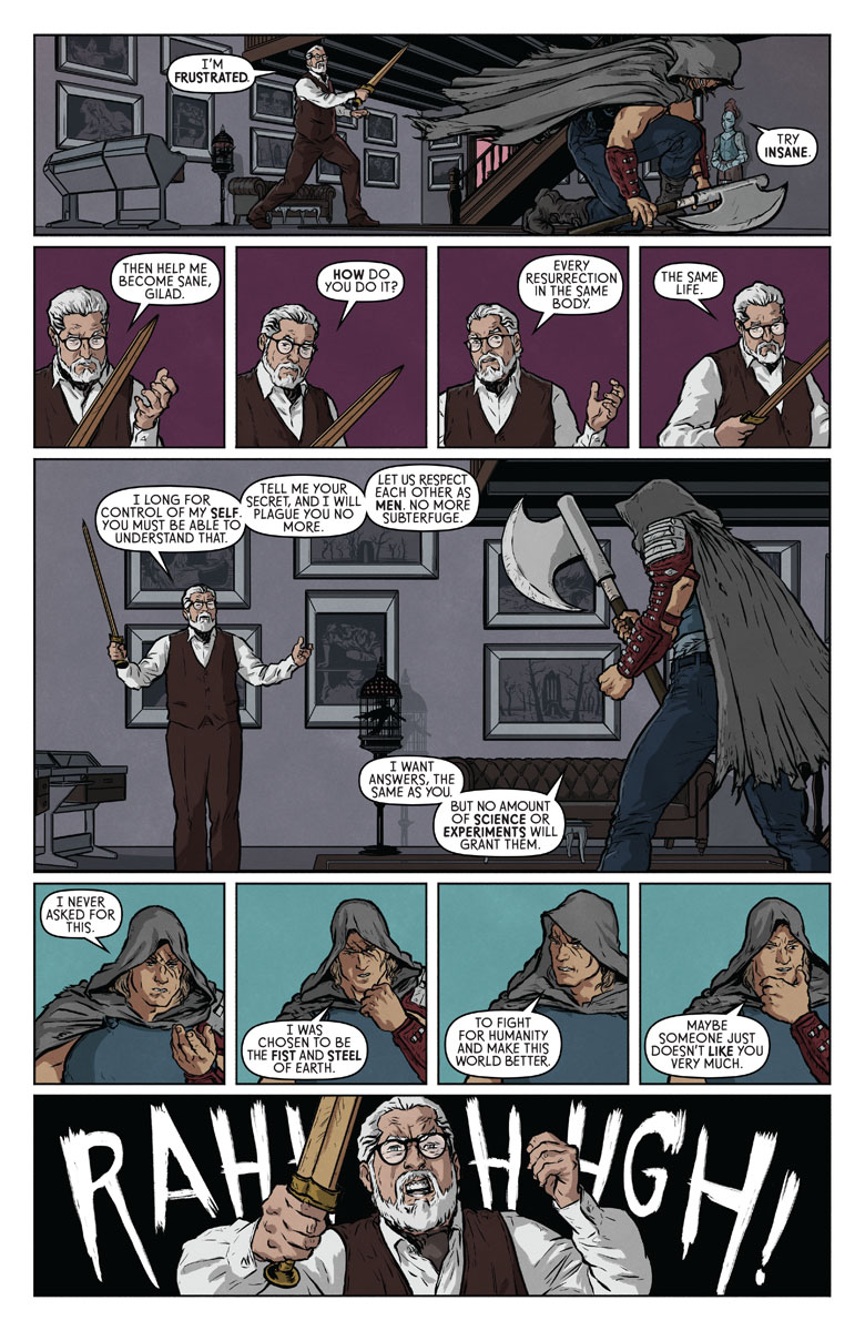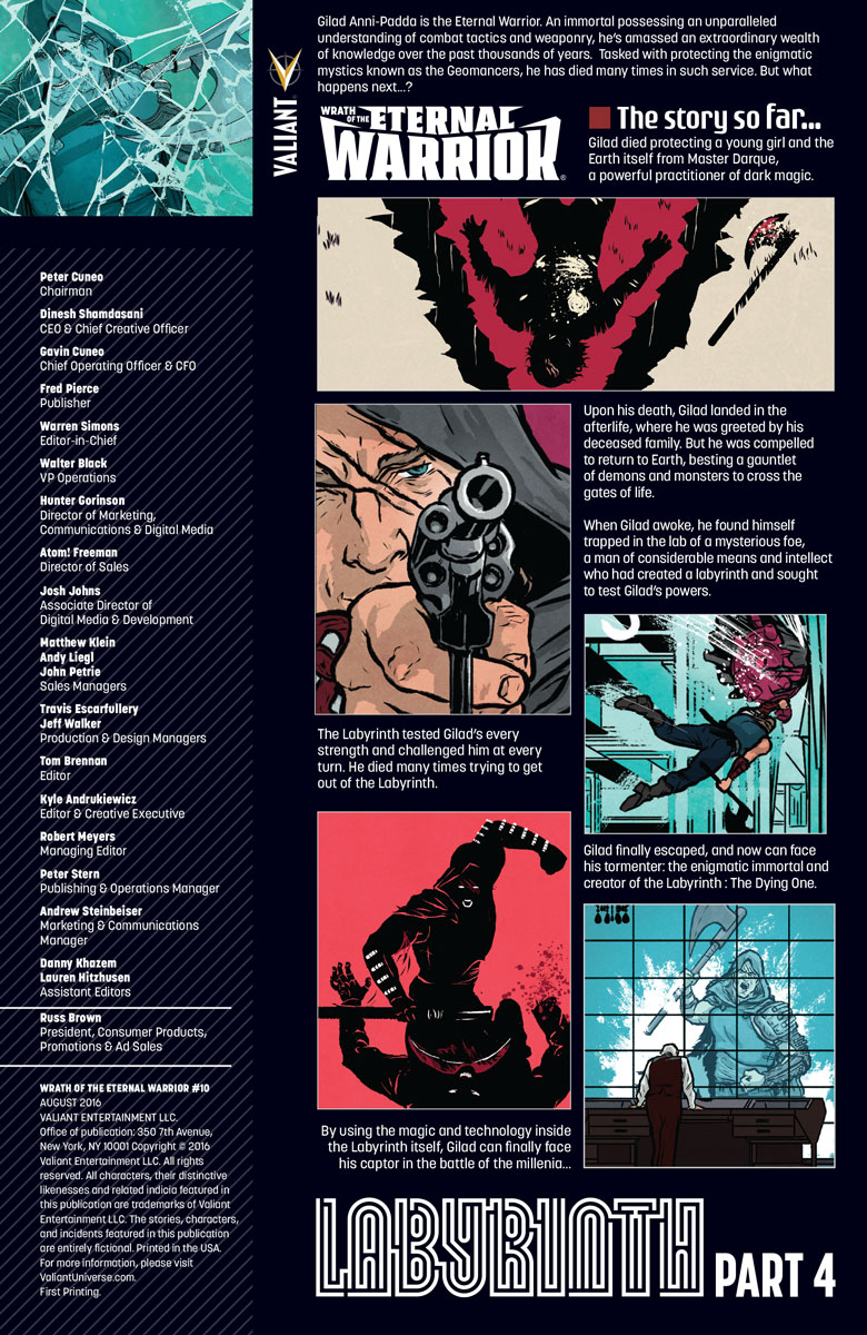 Against all odds, the Eternal Warrior has fought his way to the Labyrinth’s brutal and mysterious center. But his suffering is far from over! Standing between the Earth’s immortal master of war and freedom stands the figure only known as the Dying One…and the masterstroke in his centuries-long plan to unlock the secret of the Eternal Warrior’s immortality! Battered but not beaten, can Gilad Anni-Padda rise once more to fell his greatest foe…or will the madness of the “LABYRINTH” break his mind as well as his body?