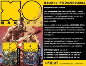 Available only as a pre-order set. The X-O MANOWAR #1-3 PRE-ORDER EDITION BUNDLE – featuring three 48-page, massively expanded editions of X-O Manowar’s colossal opening story arc – can only be ordered as a set and must be ordered with your local comic shop by the initial order date of January 26th, 2017! Released monthly from March through May, each PRE-ORDER EDITION comes packed with trade paperback-style extras and bonus content, including creator commentary, behind-the-scenes looks at the creation of the comics, process character designs and artwork, and first looks at upcoming issues.