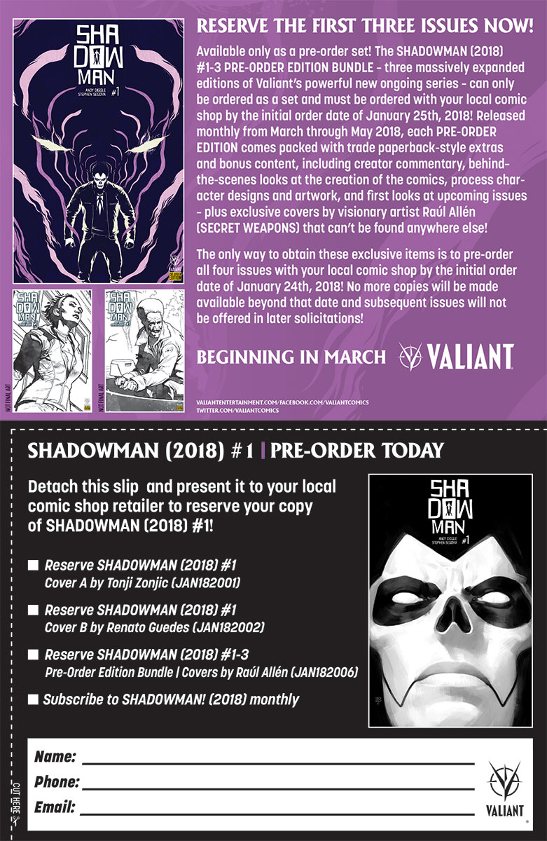 The SHADOWMAN (2018) #1-3 PRE-ORDER EDITION BUNDLE – three massively expanded editions of Valiant’s powerful new ongoing series – can only be ordered as a set and must be ordered with your local comic shop by the initial order date of January 24th, 2018! Released monthly from March through May 2018, each PRE-ORDER EDITION comes packed with trade paperback-style extras and bonus content, including creator commentary, behind–the-scenes looks at the creation of the comics, process character designs and artwork, and first looks at upcoming issues – plus exclusive covers by visionary artist Raúl Allén (SECRET WEAPONS) that can’t be found anywhere else!.