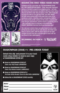 The SHADOWMAN (2018) #1-3 PRE-ORDER EDITION BUNDLE – three massively expanded editions of Valiant’s powerful new ongoing series – can only be ordered as a set and must be ordered with your local comic shop by the initial order date of January 24th, 2018! Released monthly from March through May 2018, each PRE-ORDER EDITION comes packed with trade paperback-style extras and bonus content, including creator commentary, behind–the-scenes looks at the creation of the comics, process character designs and artwork, and first looks at upcoming issues – plus exclusive covers by visionary artist Raúl Allén (SECRET WEAPONS) that can’t be found anywhere else!.