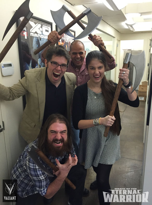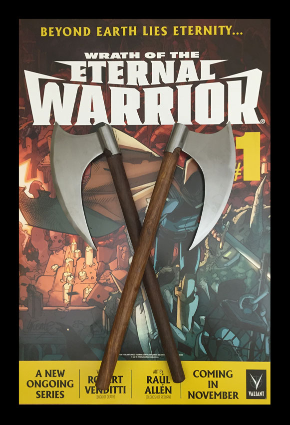 “WRATH OF THE ETERNAL WARRIOR #1 is already on track to become one of Valiant’s single biggest releases of the year, and we want to give our retail partners a razor-sharp token of appreciation for making 2015 Valiant Entertainment’s most successful year yet,” said Valiant Publisher Fred Pierce. “There is a long-term plan in place for the Eternal Warrior, and, as you’ll soon see in WRATH OF THE ETERNAL WARRIOR #1, the character is about to take his rightful place as one of single most important heroes in the Valiant Universe. What better way to show the world we mean it than with a two-handed implement of destruction in stores nationwide? Whether you’re a dedicated fan or a 7,000-year-old immortal soldier, these distinctive comic collectibles will be the ultimate accent to your local comic shop, bar none.”