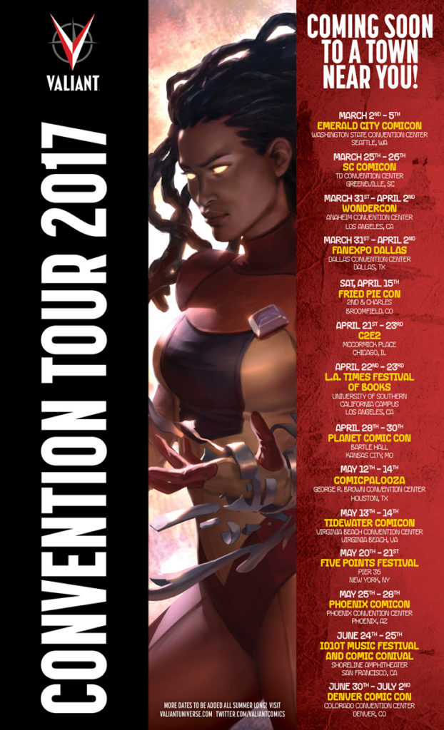 Valiant is proud to unveil its first round of dates and destinations for the VALIANT 2017 CONVENTION TOUR – a months-long, cross-country comics roadshow coming soon to a town near you! Kicking off this March with multiple exciting events, Valiant’s touring convention crew is charging through from west to east throughout the spring and summer with stops in Chicago, Dallas, Denver, Los Angeles, and many more along the way: