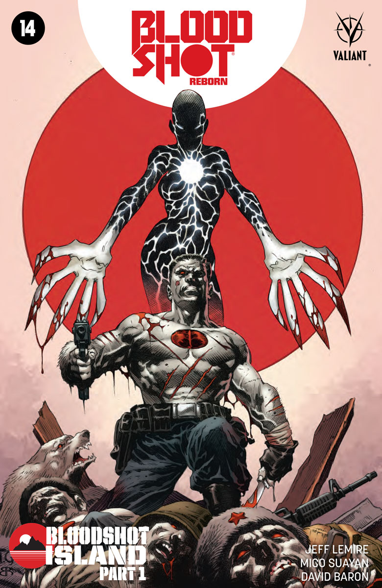 Then: New York Times best-selling writer Jeff Lemire (Old Man Logan, Moon Knight) and blockbuster artist Mico Suayan (BLOODSHOT REBORN) drop Valiant’s nanite-enhanced commando into a scorching trial by fire in the BLOODSHOT REBORN #14 SECOND PRINTING – re-presenting the explosive FIRST ISSUE of “BLOODSHOT ISLAND“! Live. Die. Rejuvenate. Each day, Bloodshot and his predecessors awake to find themselves hunted by the unstoppable engine of destruction called Deathmate. And each day, they die…only to begin their escape once more after the nano-technology inside them repairs their fatal injuries. As Bloodshot and his new teammates begin to understand the brutal logic behind their seaside prison, will the biggest threat to their survival be the horrors that await in the jungle around them…or each other?