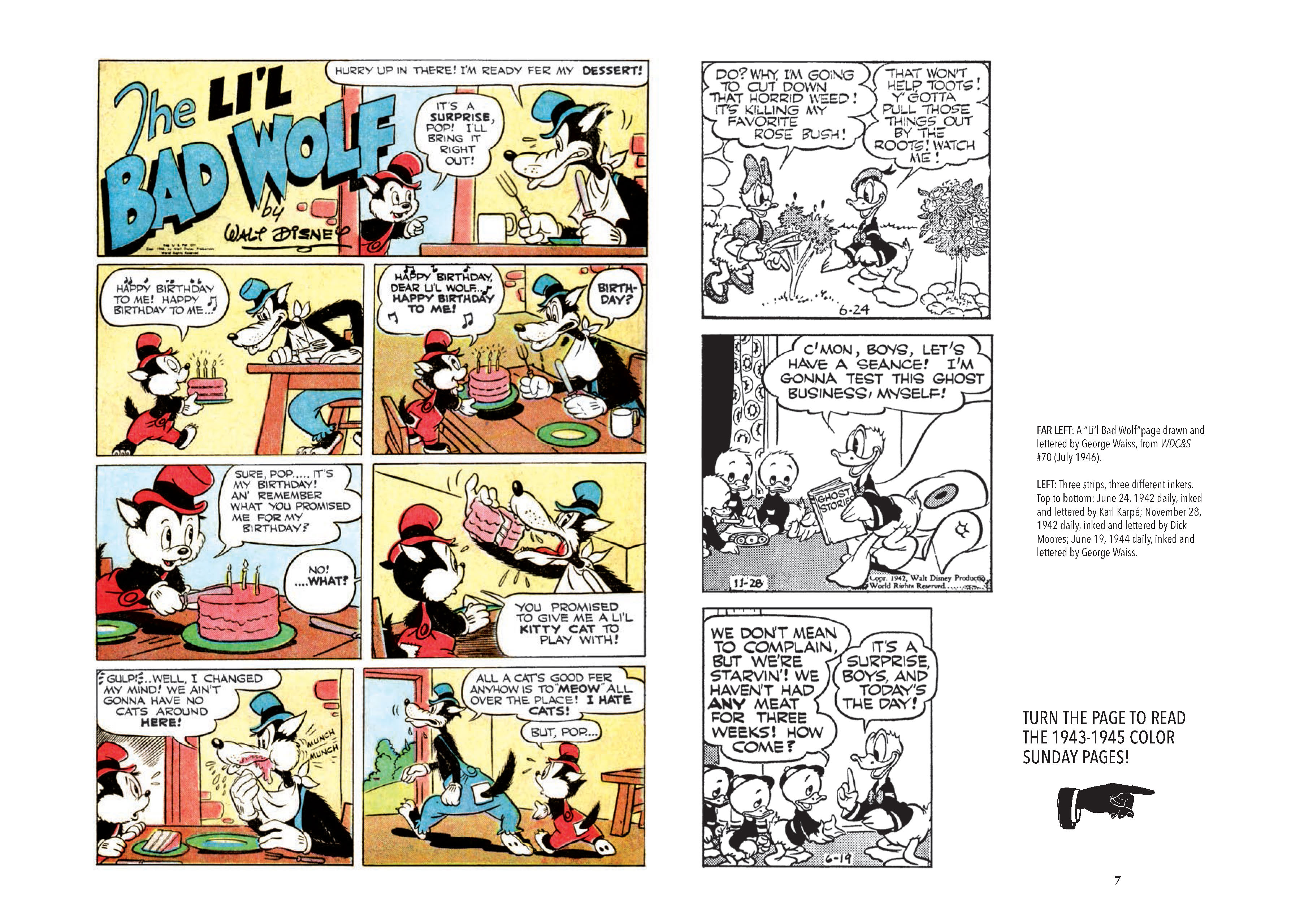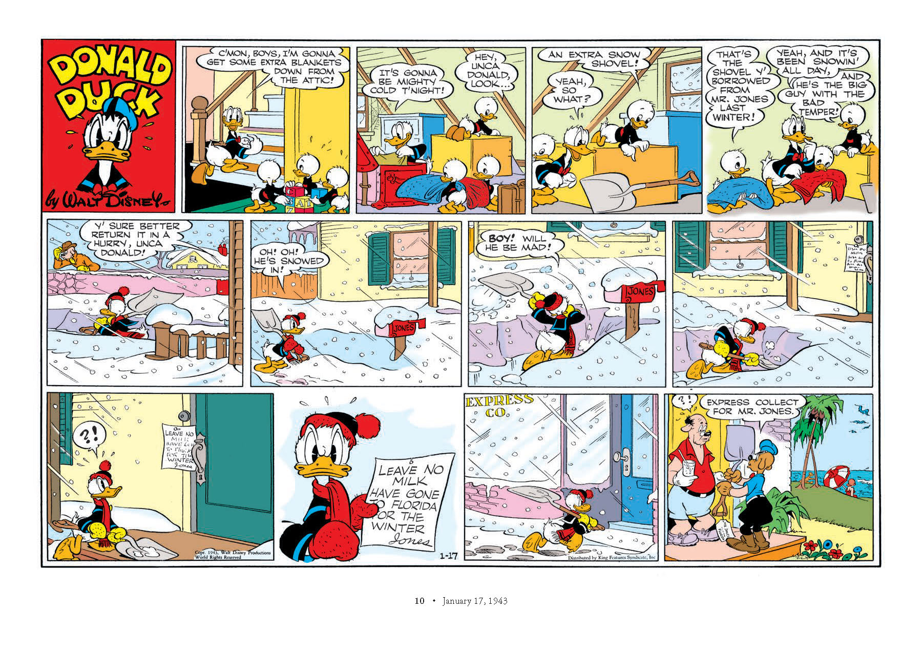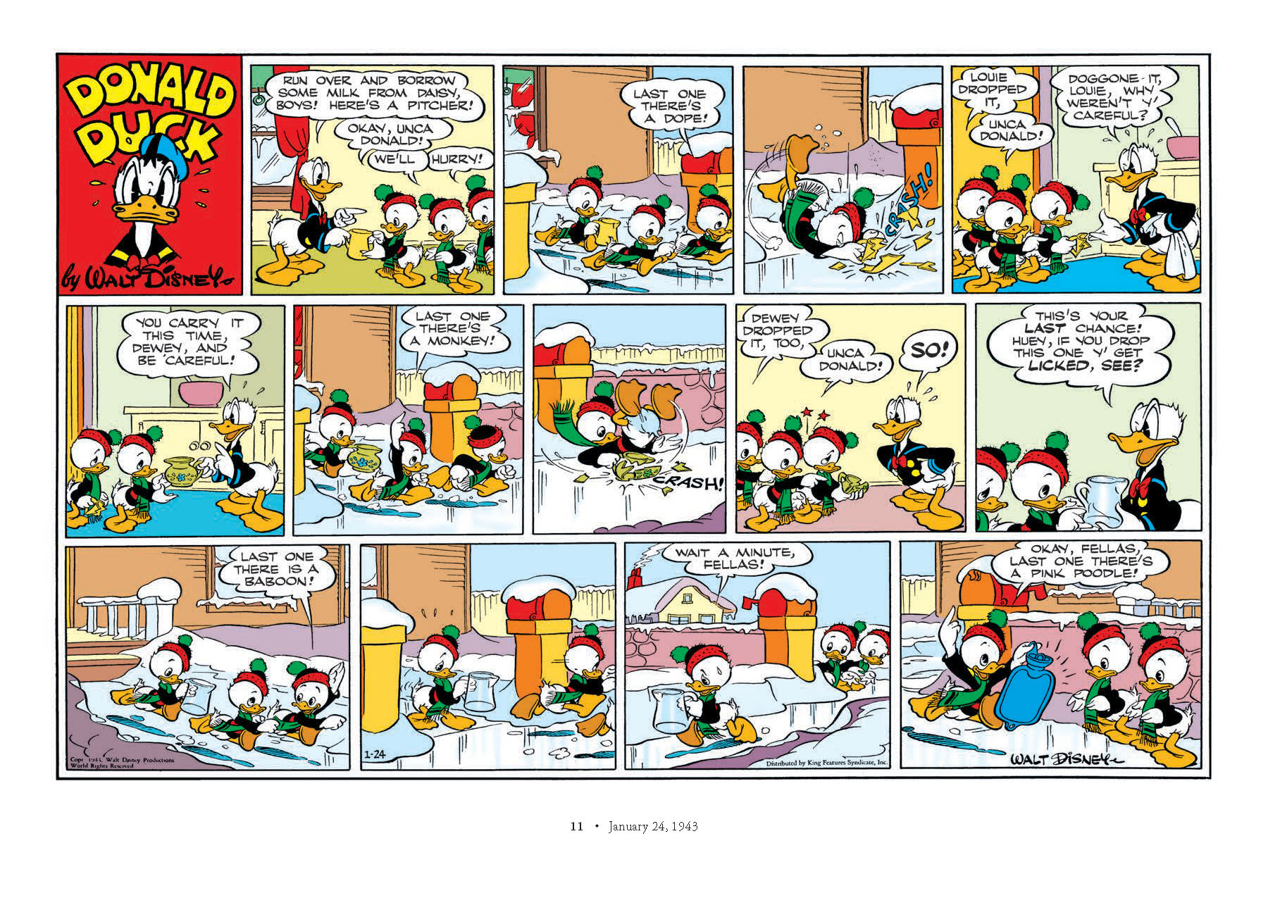 From deeper in the Disney Vaults, our second volume collects three more complete years of Sunday fun—every color page from January 1943 through December 1945. By the end of the book, WWII is (literally) history and Donald, Daisy, and those incorrigible nephews find more than their share of joy—and mayhem—in Duckberg. Disney scholar Alberto Becattini provides an introduction that puts the strips in historical perspective, and tells us about George Waiss, who joined the creative team in 1943, taking on the inking chores over Al Taliaferro’s pencils.