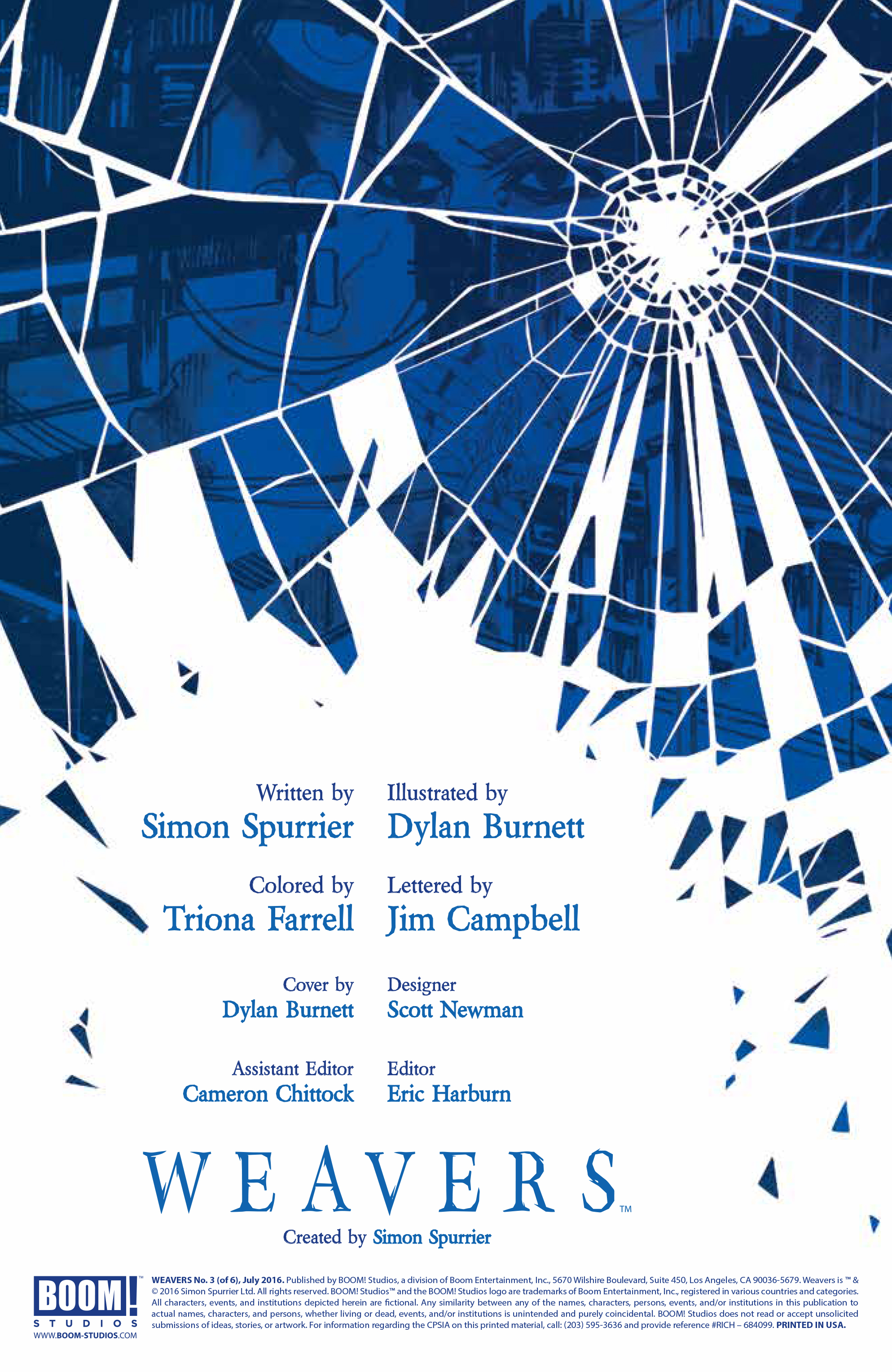 PreviewsBOOM! Studios Previews WEAVERS #3 By Comix Asylum - Jul 11, 2016 0 623 FacebookTwitterPinterestWhatsApp Weavers #3 (of 6) Publisher: BOOM! Studios Writer: Simon Spurrier Artist: Dylan Burnett Cover Artist: Dylan Burnett Price: $3.99 Synopsis: As Sid and Frankie hunt down a lead, Sid does a little digging in secret from the Weavers. WEAVERS #3 1 of 7
