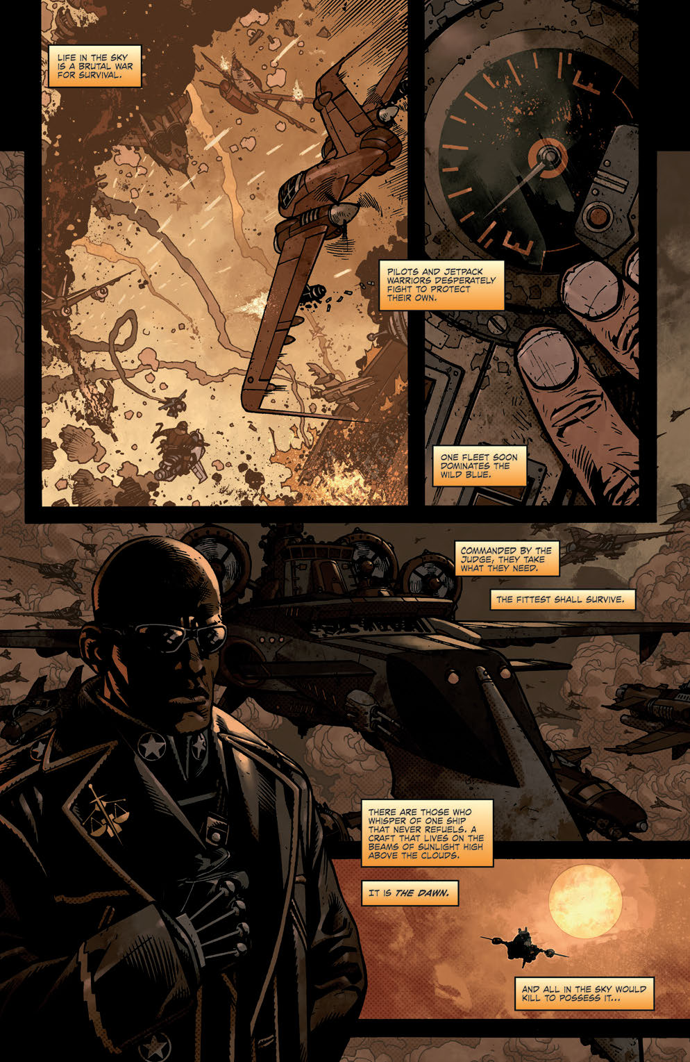 While navigating the dangers of a post-apocalyptic society in the sky, Cola, a teenage fighter pilot and her family fight to protect The Dawn, their solar powered flying fortress and home. With the world in chaos, bullets dwindling, and fuel drying up, the few survivors in the sky must use anything at their disposal in order to survive. Battles rage from ship to ship as jet-pack warriors, planes, and crew members scratch and claw to claim the few crumbs society left behind. Hunted by The Judge and his armada of warships, The Dawn will be forced to fight insurmountable odds in order to survive.