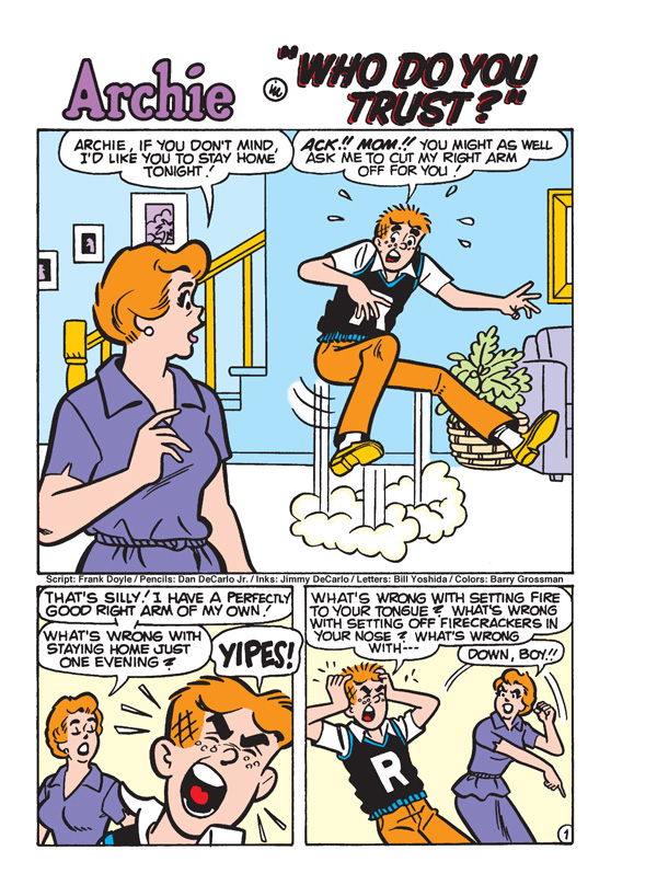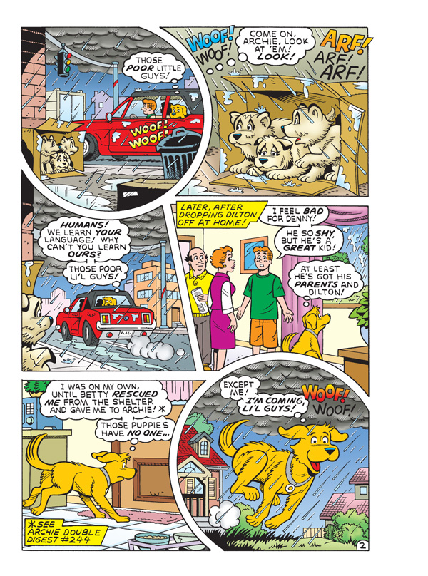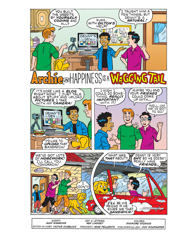 Archie, along with his furry friend Vegas and brainy buddy Dilton, are visiting Denny—a young, shy boy who Dilton has worked with to create his own website. Meanwhile, Vegas helps some shy, young friends of his own when he encounters some abandoned puppies left under a garbage dumpster in a rain storm. Can he find safety for these pups? How can Denny help? Find out in “Happiness is a Wagging Tail!” the heart-warming lead story to this comics annual!