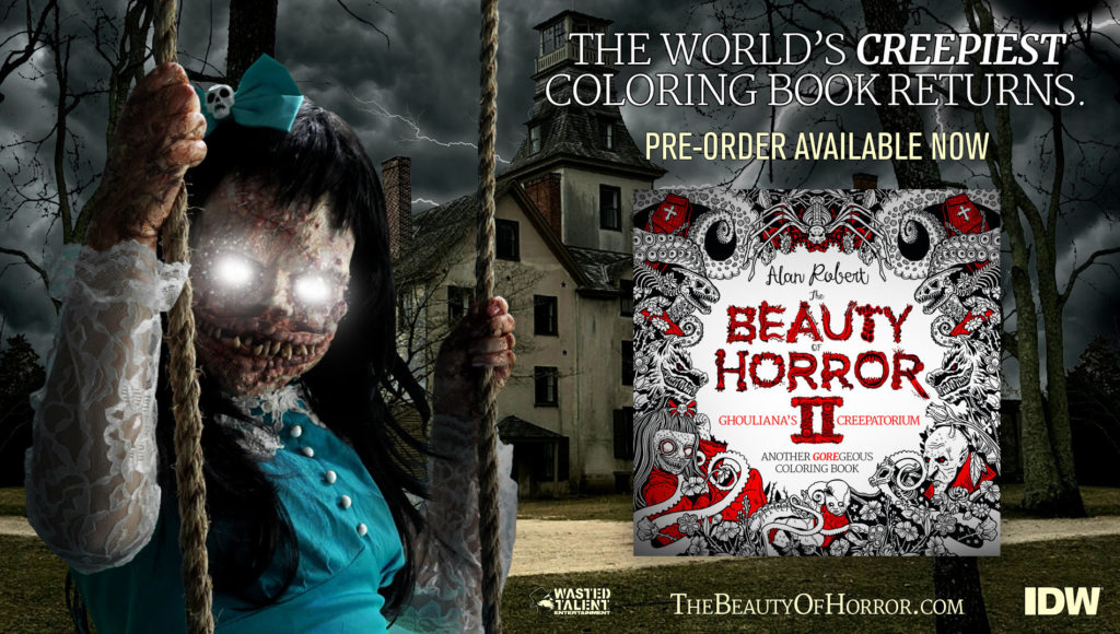 “Alan has topped himself again,” says IDW VP of New Product Development, Jerry Bennington. “Not only is the coloring book twice as creepy as its predecessor, but the trailer ups the chill factor to nightmare-inducing levels to satisfy horror fans everywhere.”