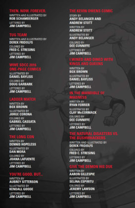 - Featuring an all-star roster of writers and artists including Dennis Hopeless, Box Brown, Tini Howard, Ed McGuinness, Rob Guillory, Dan Mora, Andy Belanger, Jorge Corona, and Daniel Bayliss, this collection celebrates the rich history of WWE throughout the years.