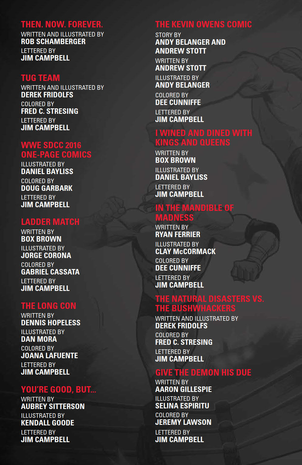 - Collects the WWE WrestleMania 2017 Special, the WWE Summer Slam 2017 Special, and the backup shorts from WWE issues #1-8.