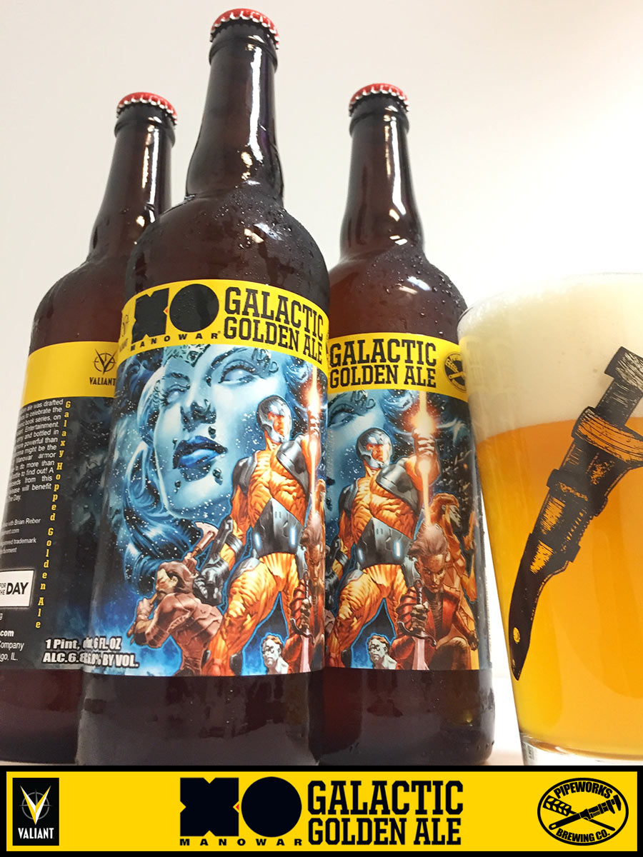 As revealed today at ComicBook.comValiant Entertainment and Chicago’s own Pipeworks Brewing Co. are proud to announce a brand-new, cosmos-spanning collaboration with X-O MANOWAR GALACTIC GOLDEN ALE – a limited-edition beer release set to debut this April during C2E2 2017 and coming soon to select beer retailers in Illinois and New York! A portion of the proceeds from all sales of the X-O MANOWAR GALACTIC GOLDEN ALE will benefit Hope for the Day, a Chicago-based suicide awareness non-profit dedicated to outreach, education, and prevention.