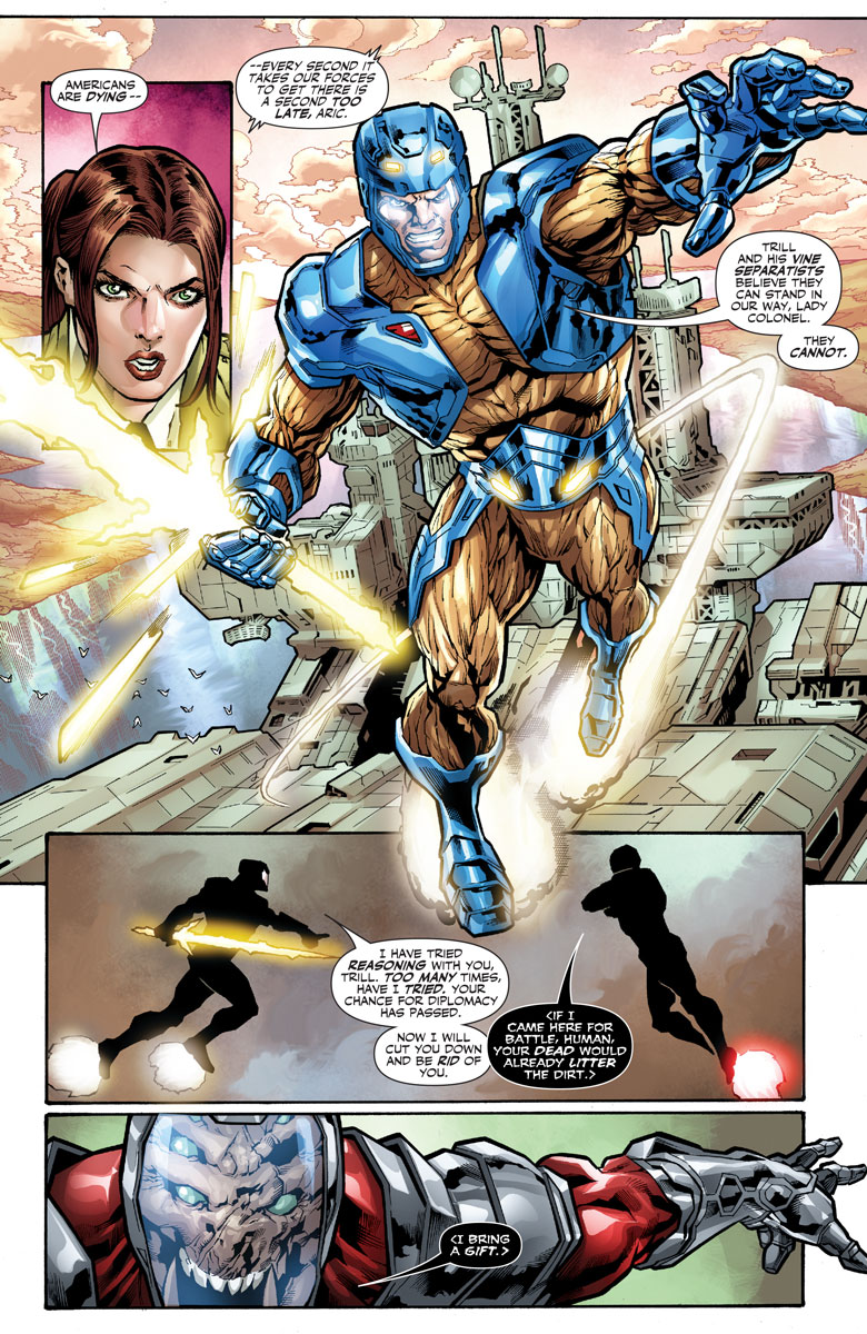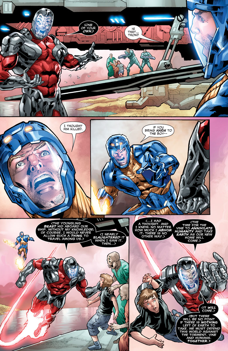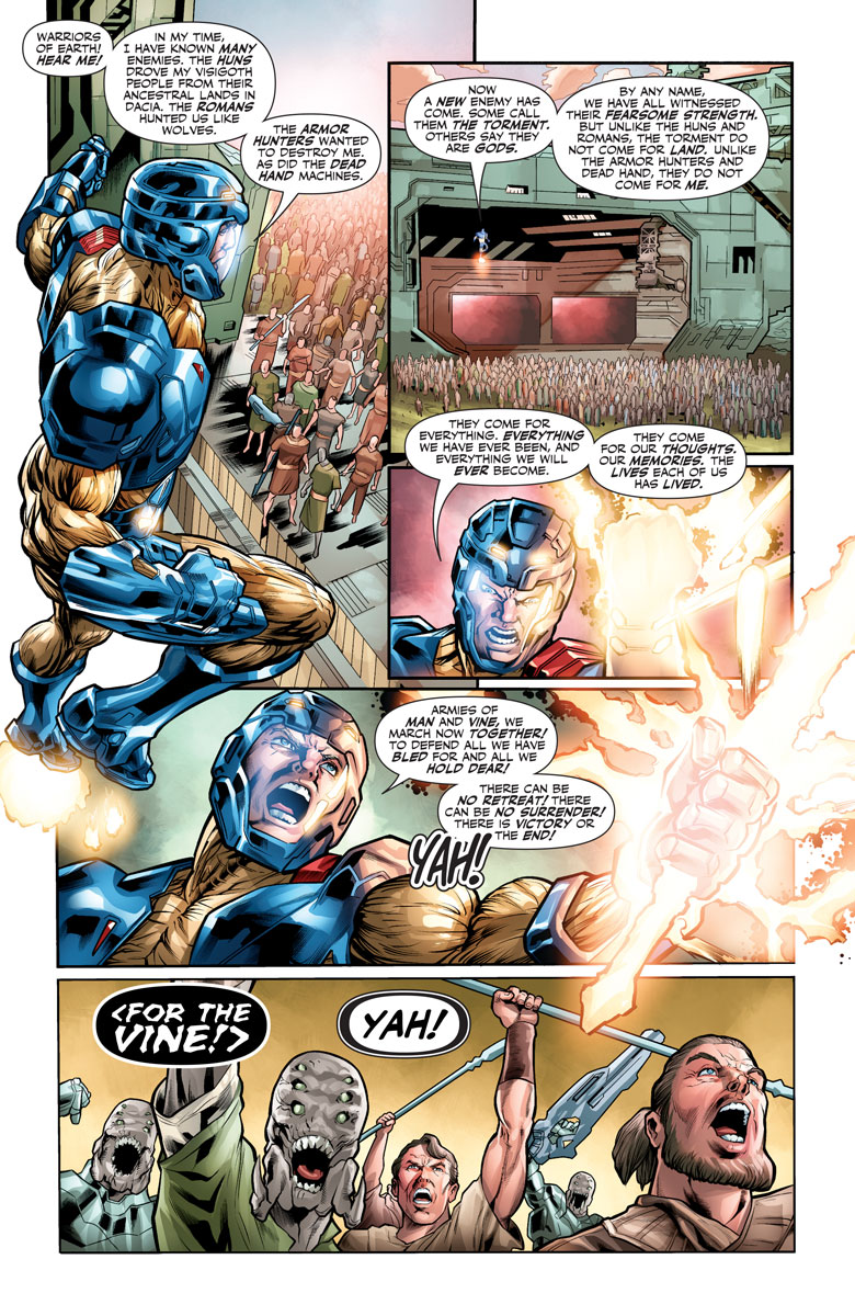 But now he faces an unthinkable new foe far more terrible than any that have come before… They are The Torment – and their name means death. Thought to be a legend by the Vine, they have now become Earth’s violent reality. As old as the universe itself, they have traveled for eons to reach us…in search of Aric of Dacia and the unstoppable X-O Manowar armor. Can Aric challenge a seemingly omnipotent threat with motives beyond the comprehension of mortal men? Will the armor truly be our world’s salvation, just as the Vine’s myths foretold? And is this the beginning of the end for X-O Manowar – or the beginning of something even bigger?