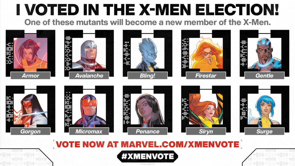 Election results, along with the full X-Men team, will be unveiled during the Hellfire Gala in Marvel comics this June. The results will be completely determined by your votes, so share your vote and campaign for your favorite X-Men using #XMenVote and stay tuned to Marvel.com and Marvel’s social channels for regular updates on the Krakoan polls.