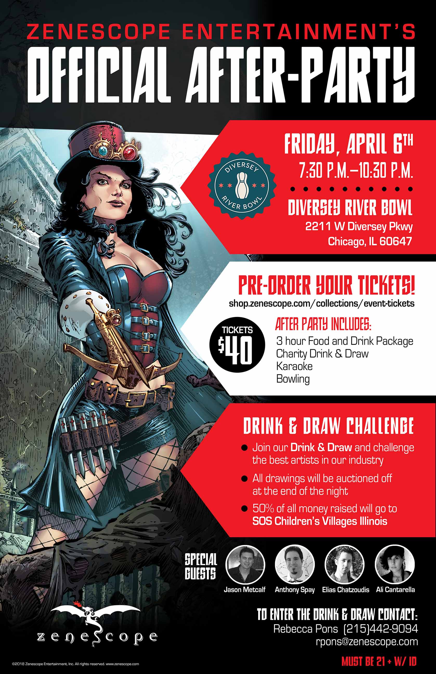 On April 6th, Zenescope will also be hosting a post-convention After Party Event at Diversey River Bowl, located at 2211 W Diversey Pkwy, Chicago, IL 60647. Guests can join Zenescope from 7:30pm-10:30pmfor a night of karaoke and bowling. This event is open to the public, but attendees can also purchase a VIP Ticket that includes a three-hour food and drink package. Zenescope’s special guests include artists Elias Chatzoudis and Jason Metcalf. Attendees will have the opportunity to go head-to-head with the guest artists in a “Drink and Draw” competition. Final artwork will be raffled off with proceeds going to SOS Children’s Villages of Illinois.